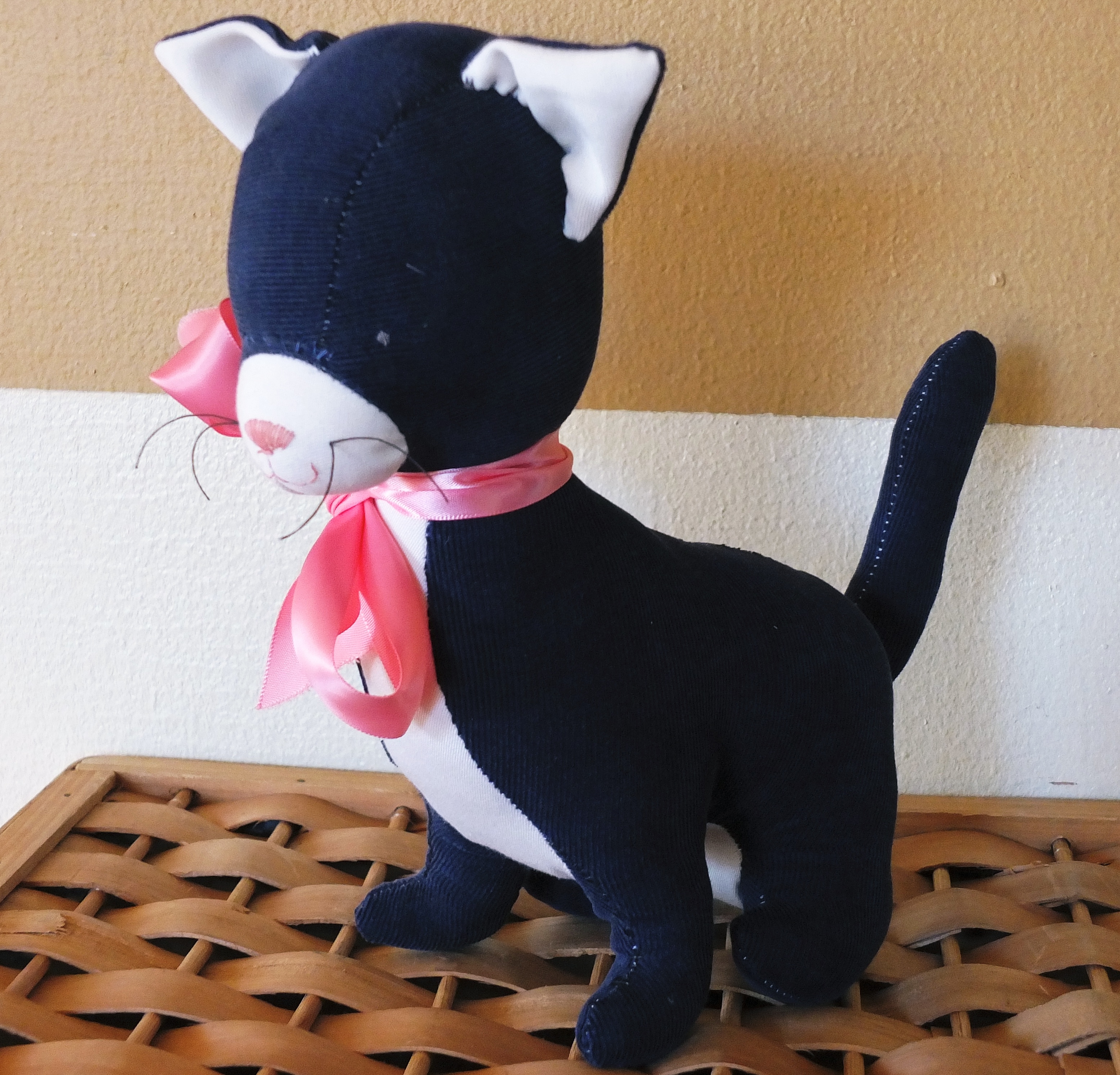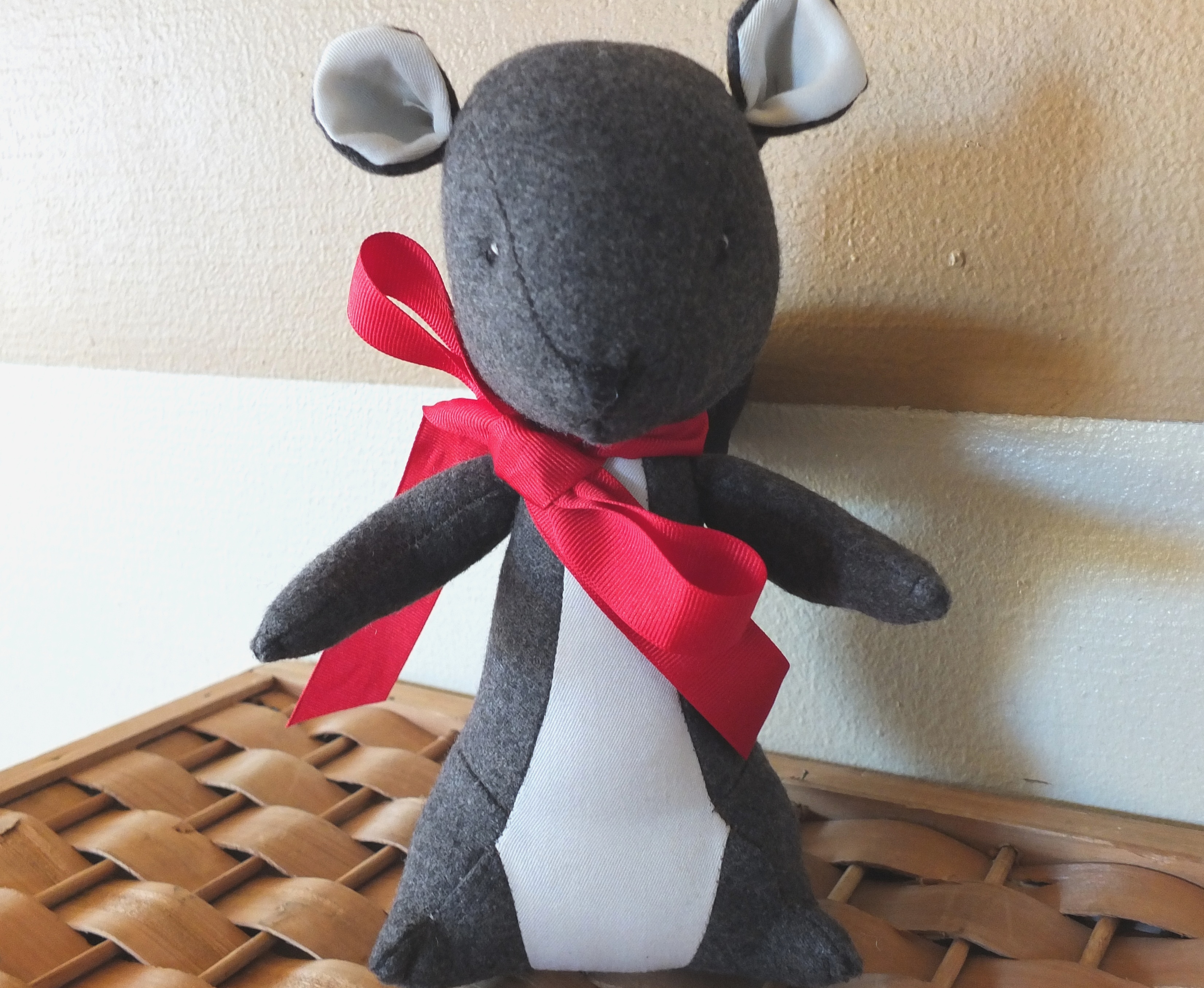 So then I tried it out in a nice, unstretchy, charcoal- colored wool. I like how this one turned out better, except every one in the family asked me if I was making a rat. Turns out, squirrels and rats look a lot alike, except for the tails. The tail made a big difference once it was on, but I think I should stick to brown colors the next time to avoid rodent confusion.