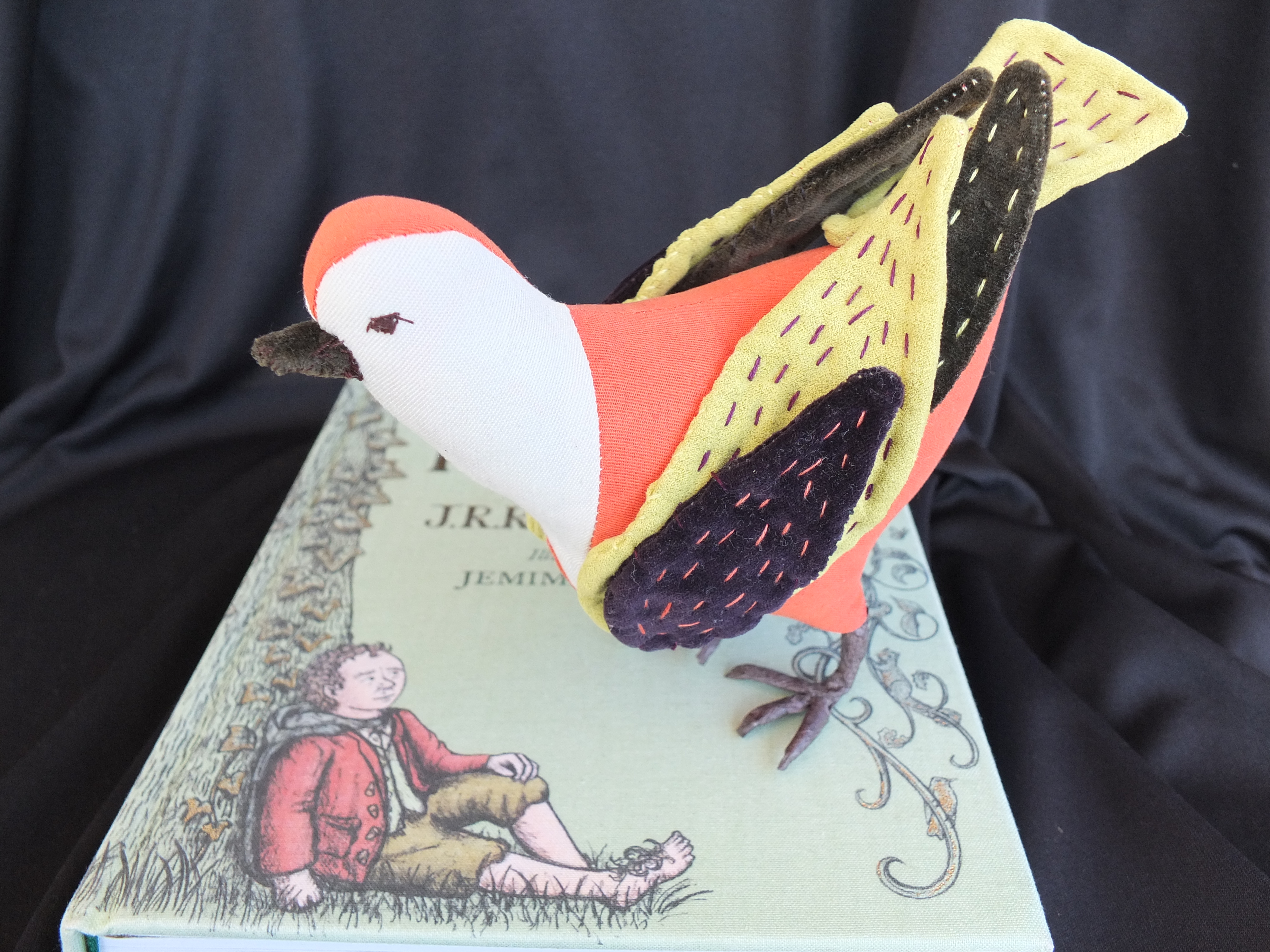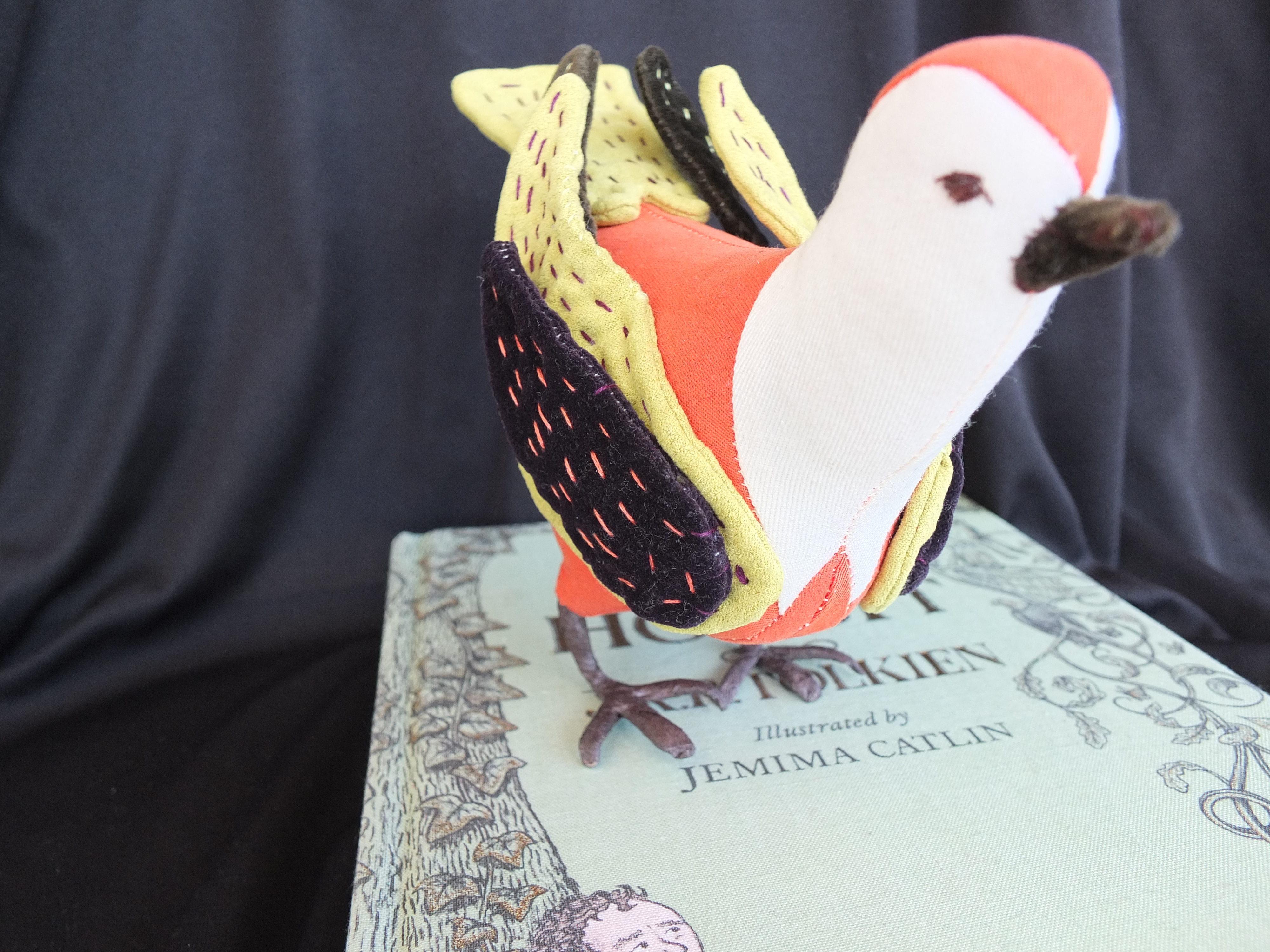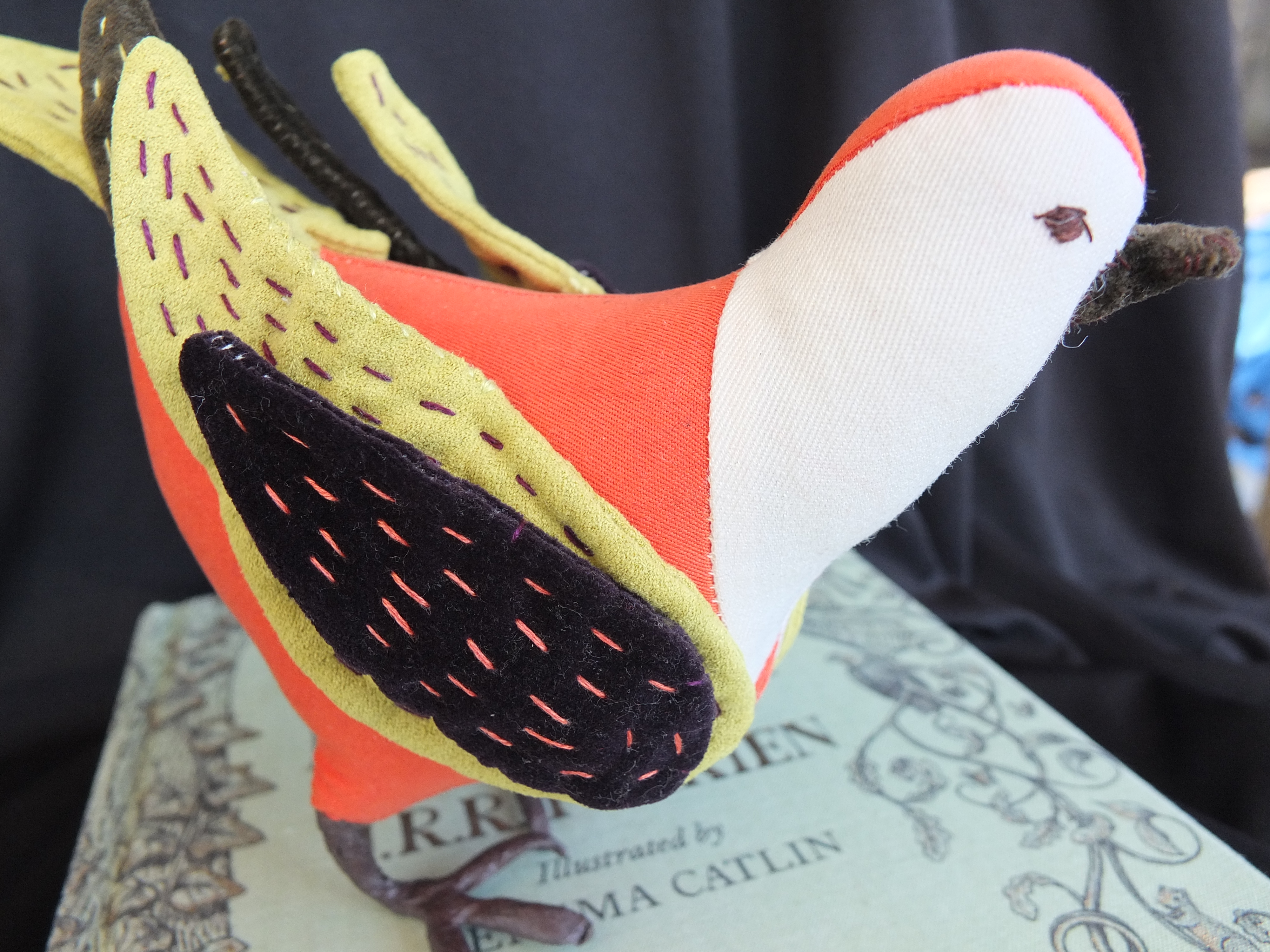 If I hadn’t been thinking about birds so much lately, I might never have taken notice of a cute little book at the library on how to make stuffed birds, by a woman named Abigail Glassenberg. I thought I would try and make a little thrush, just for fun and for the Hobbit’s sake. I went a little overboard on the colors however, since no thrush in any picture I had seen was quite as flamboyant as the one I ended up making. But I couldn’t help myself- I had a whole stack of vibrant velvet pants I was itching to repurpose.