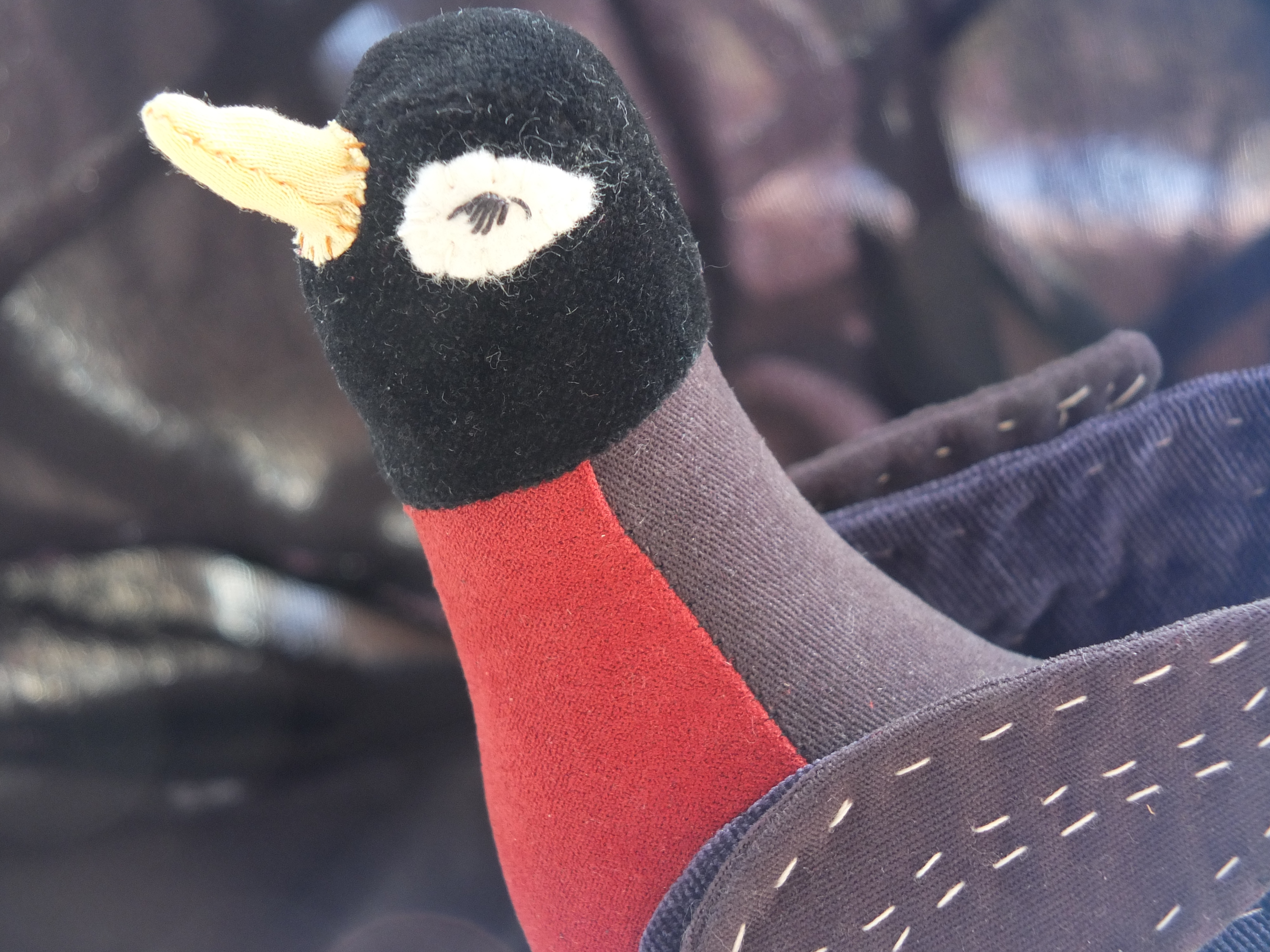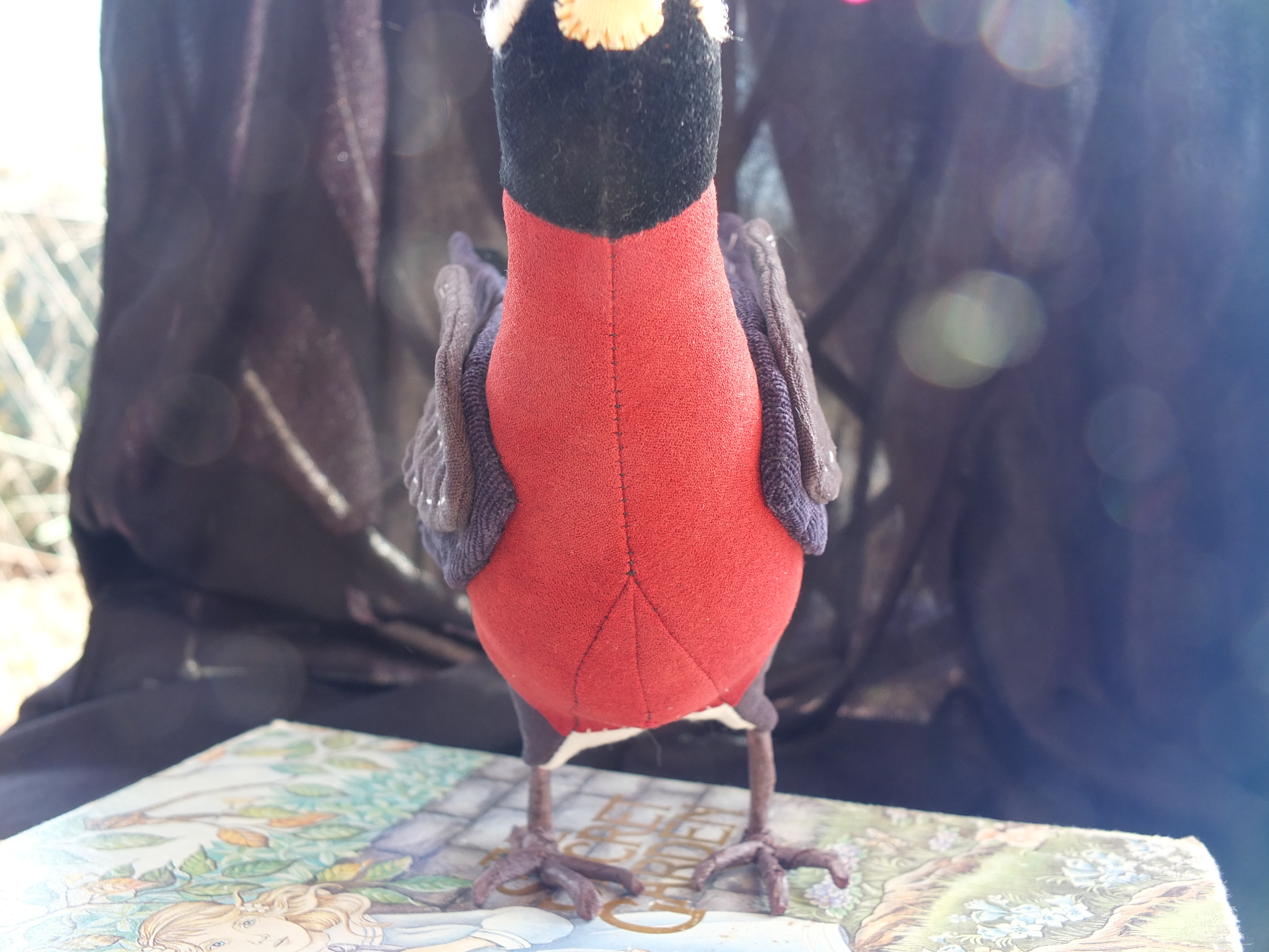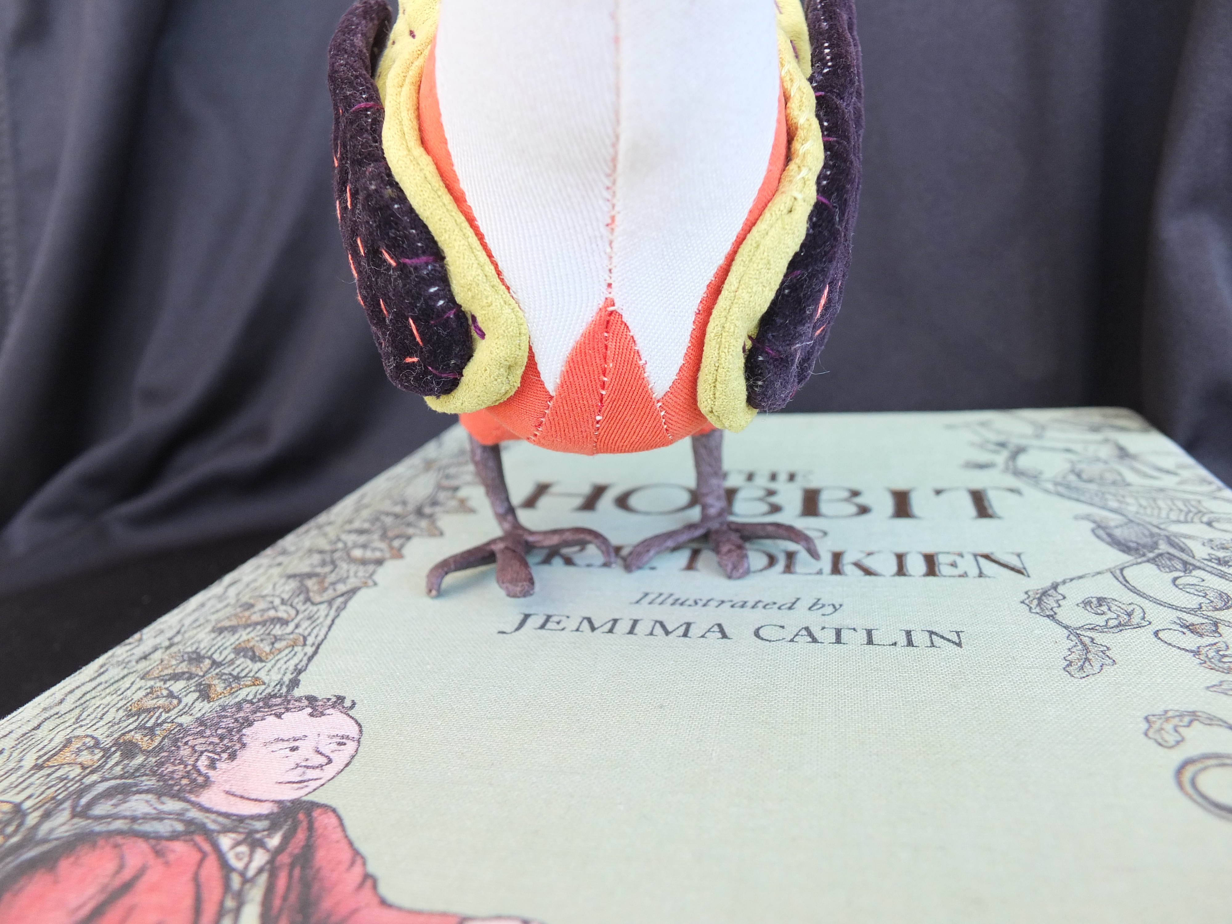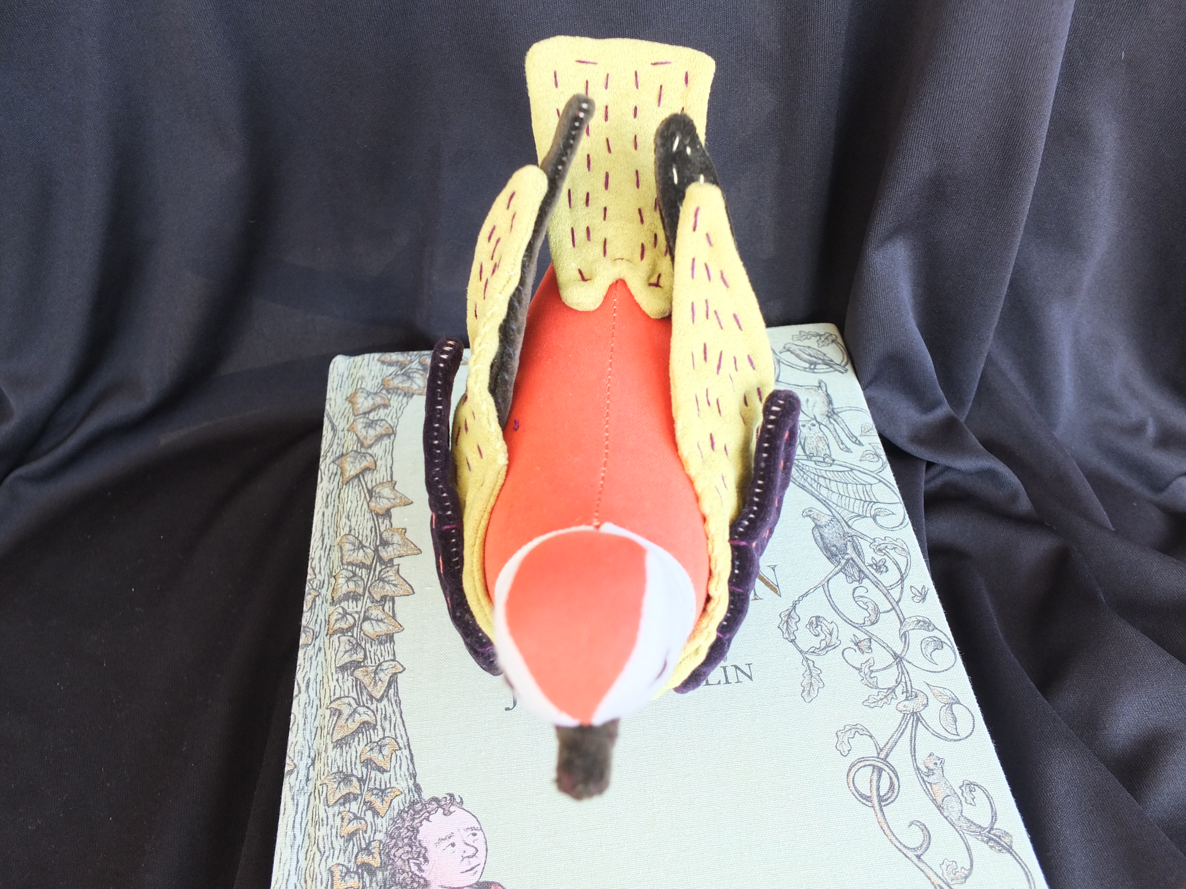 If I hadn’t been thinking about birds so much lately, I might never have taken notice of a cute little book at the library on how to make stuffed birds, by a woman named Abigail Glassenberg. I thought I would try and make a little thrush, just for fun and for the Hobbit’s sake. I went a little overboard on the colors however, since no thrush in any picture I had seen was quite as flamboyant as the one I ended up making. But I couldn’t help myself- I had a whole stack of vibrant velvet pants I was itching to repurpose.
