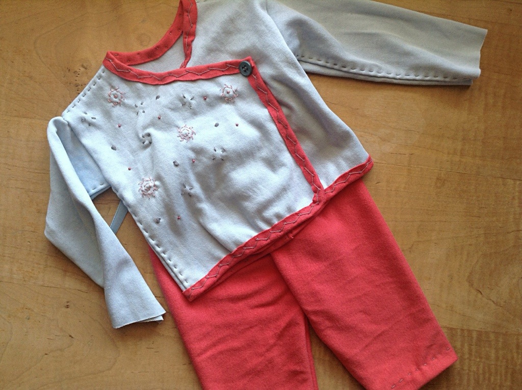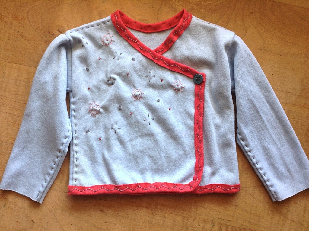 There are a whole bunch of free patterns online, and you can either use snaps as closures, or little ties. I went for snaps here, with cotton jersey fabric and a bit of Alabama Chanin technique.