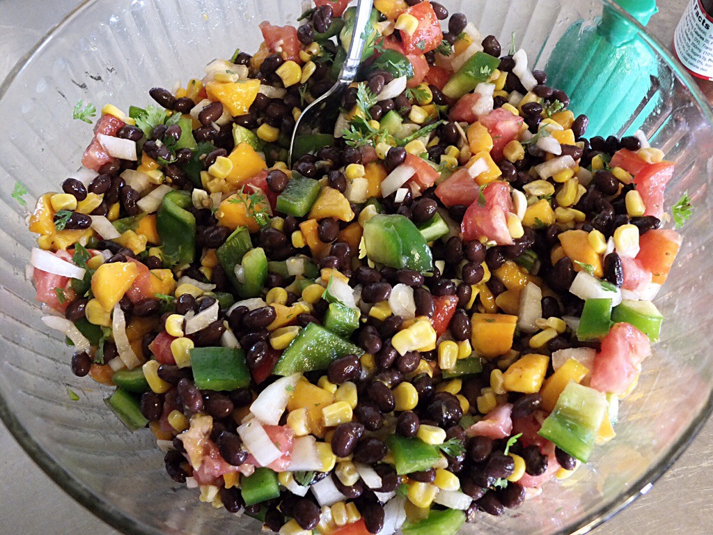 In a big bowl, put your rinsed black beans and about half a bag of frozen corn. You could, of course, slice some fresh corn off the cob, but I’m going for easy here.