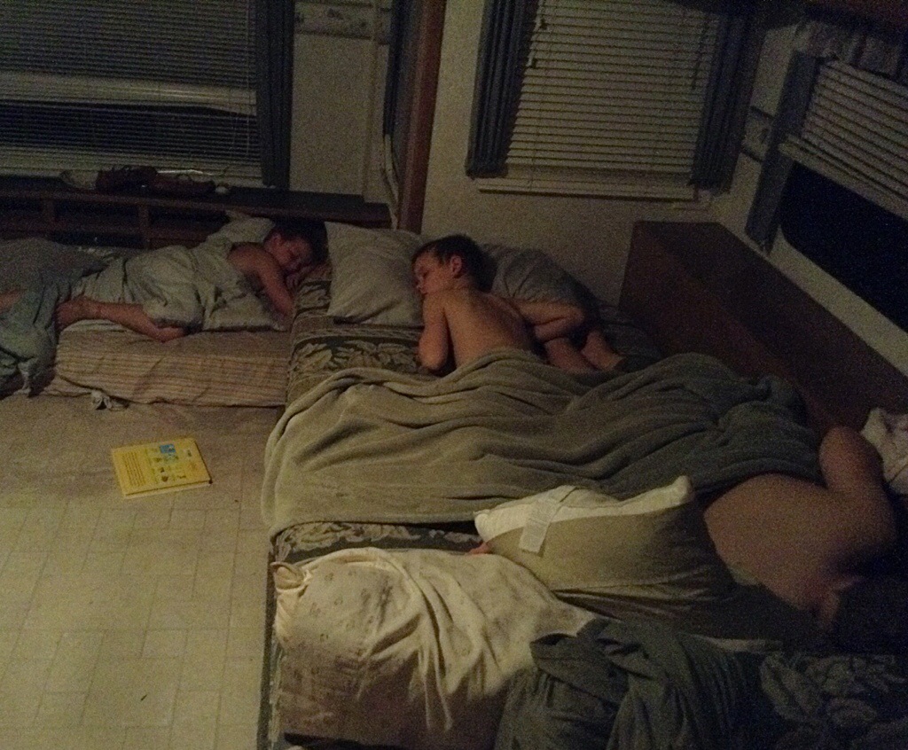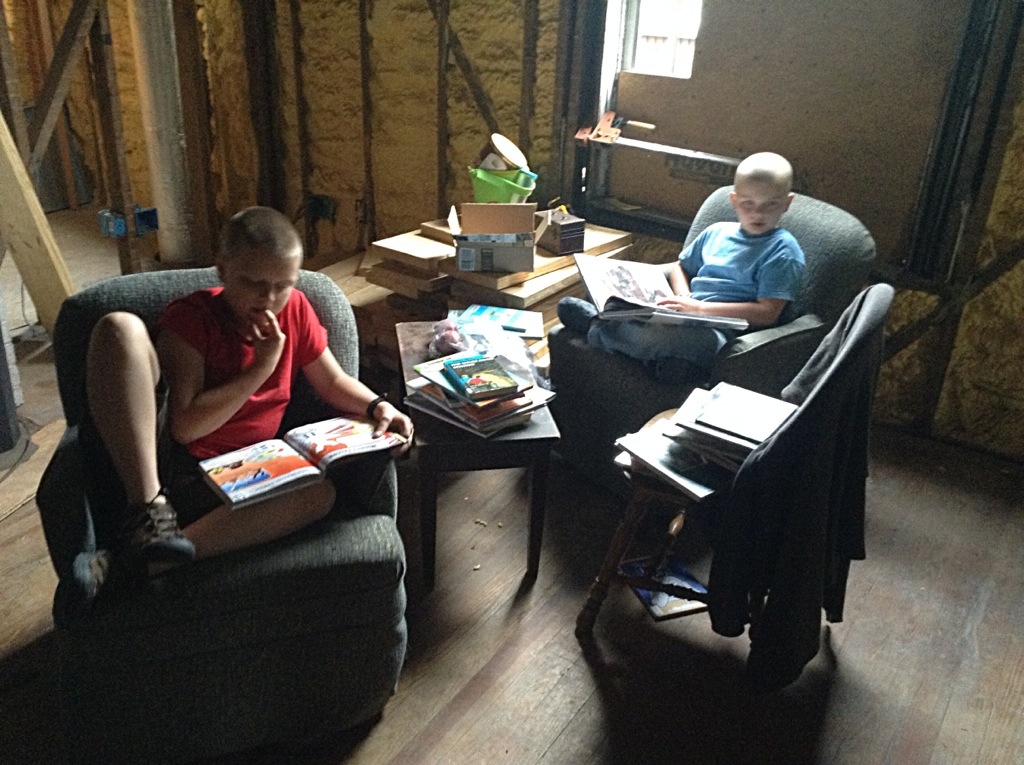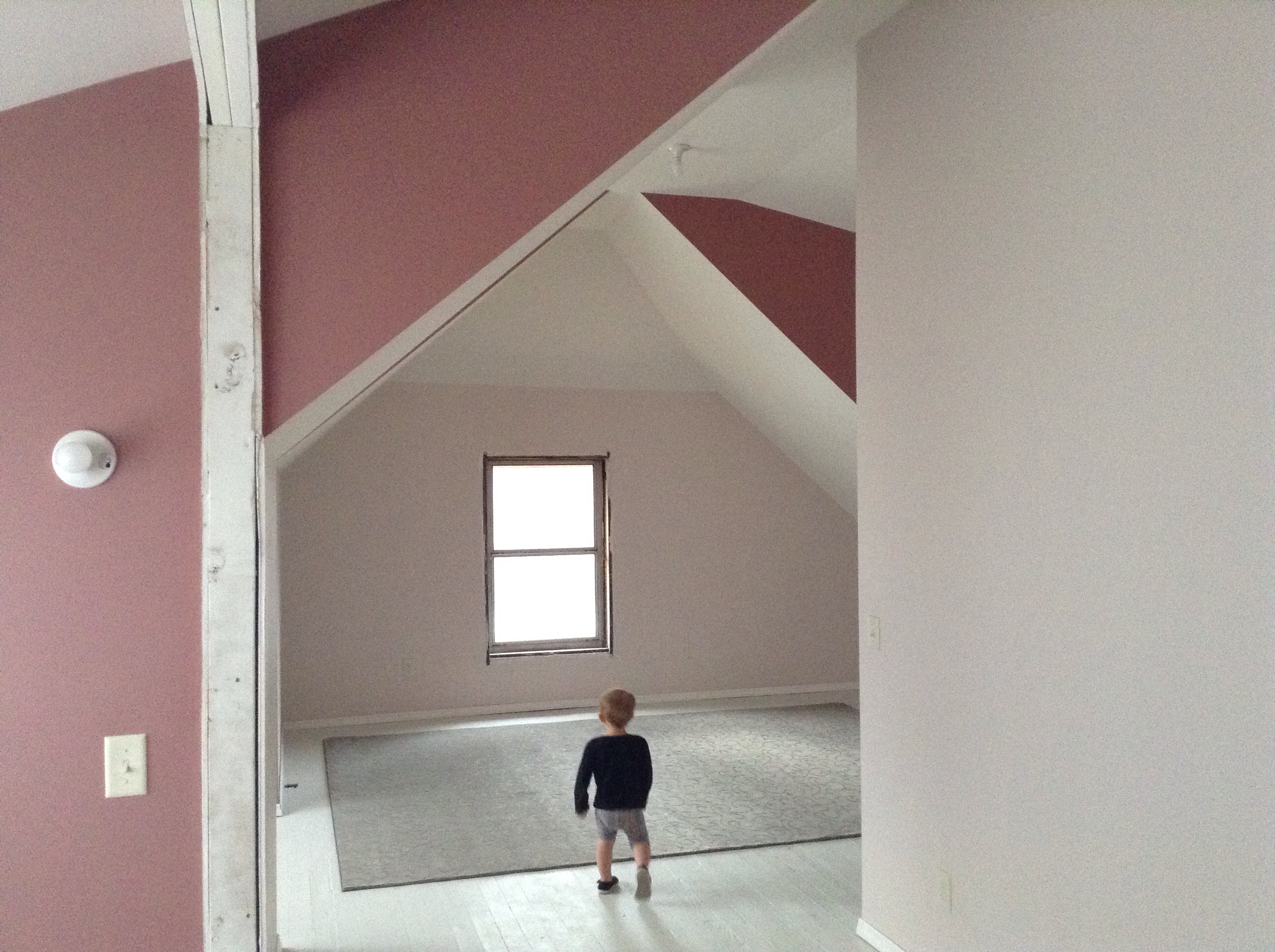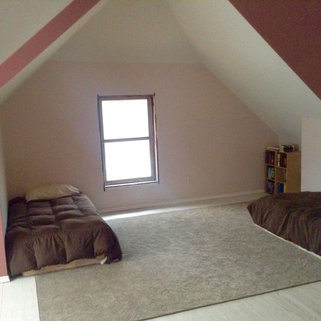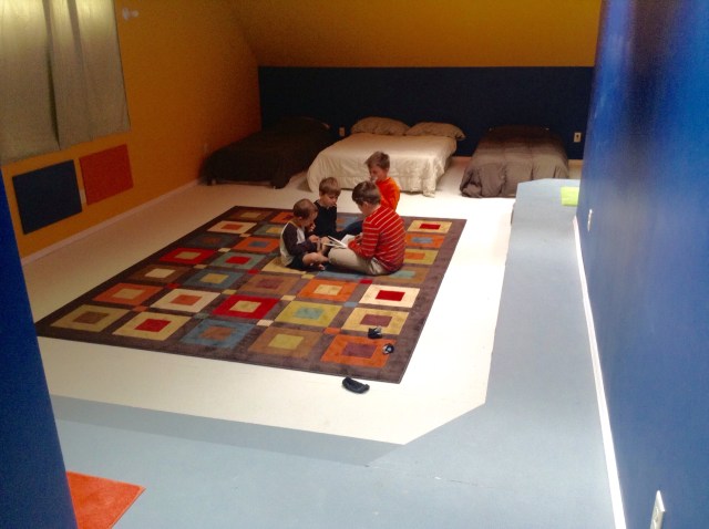 It is difficult to describe the bedrooms in the upstairs of our house and even more difficult to get a good picture of them. There are crazy angles and rooflines everywhere and are full of what would generally be called ‘character.’ The boys room is particularly character-ful. It is an enormous space in the shape of an L (“L for Lewin!” the boys like to say)