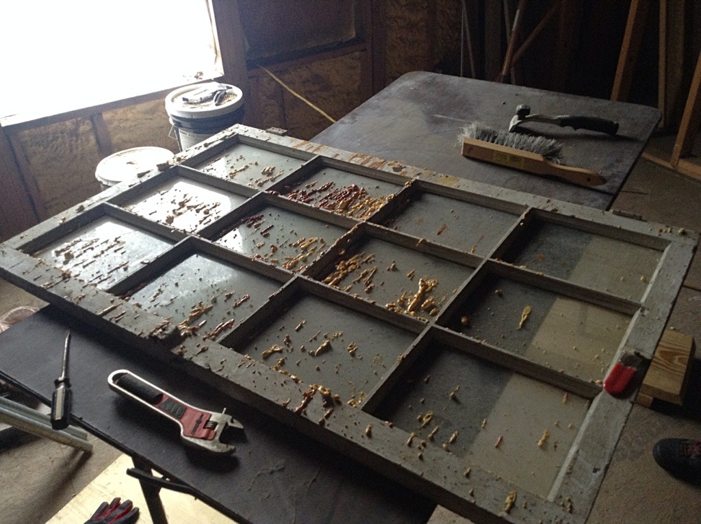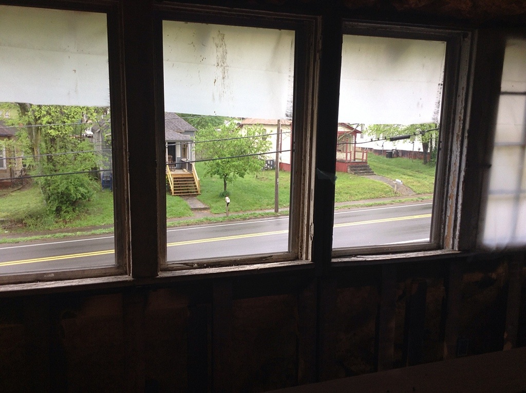 Underneath the plywood covered, windowless windows are four rectangular holes in the wall with storage space behind them.