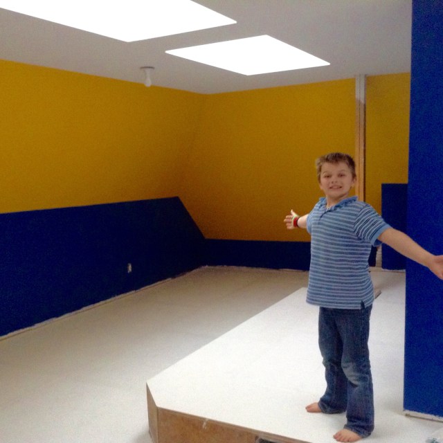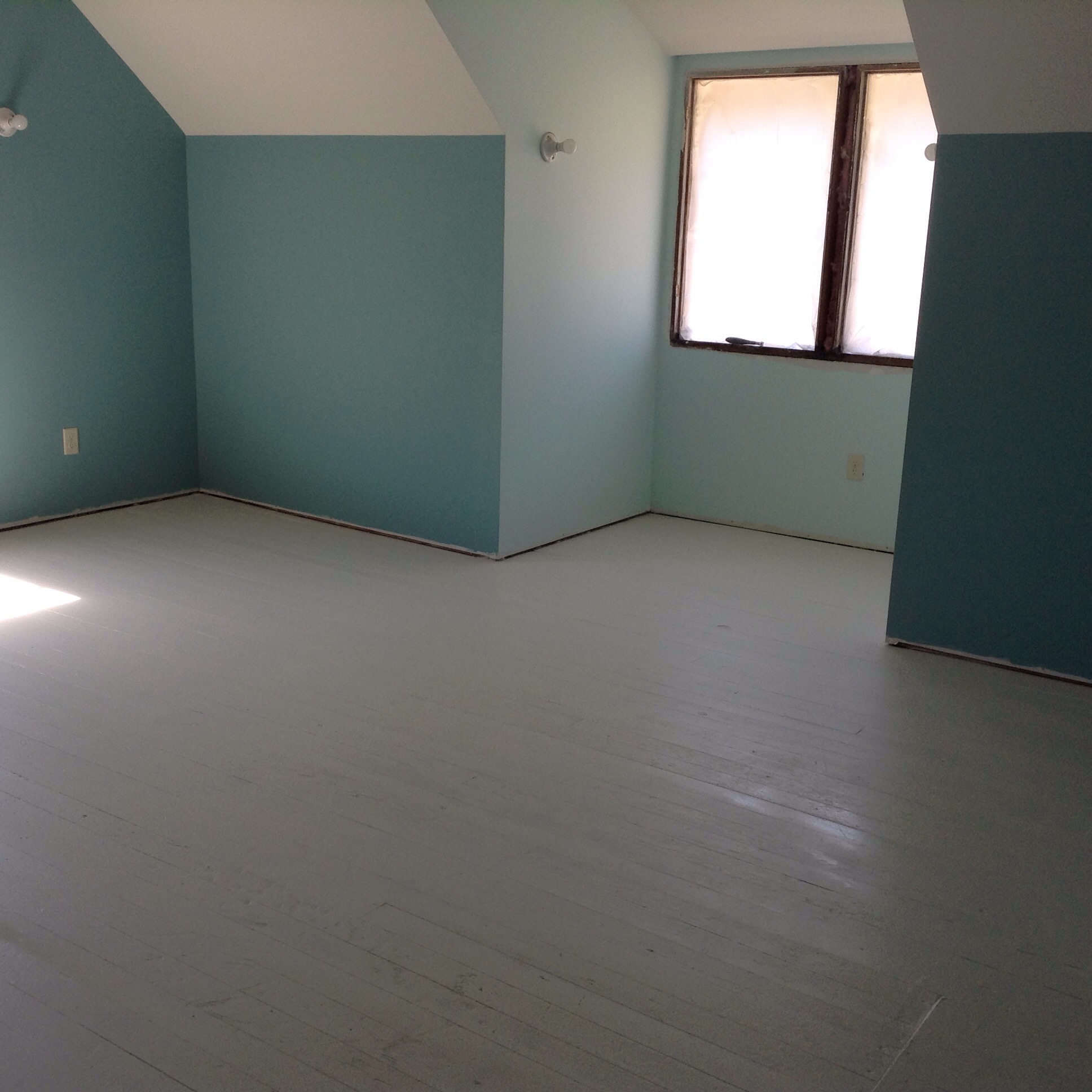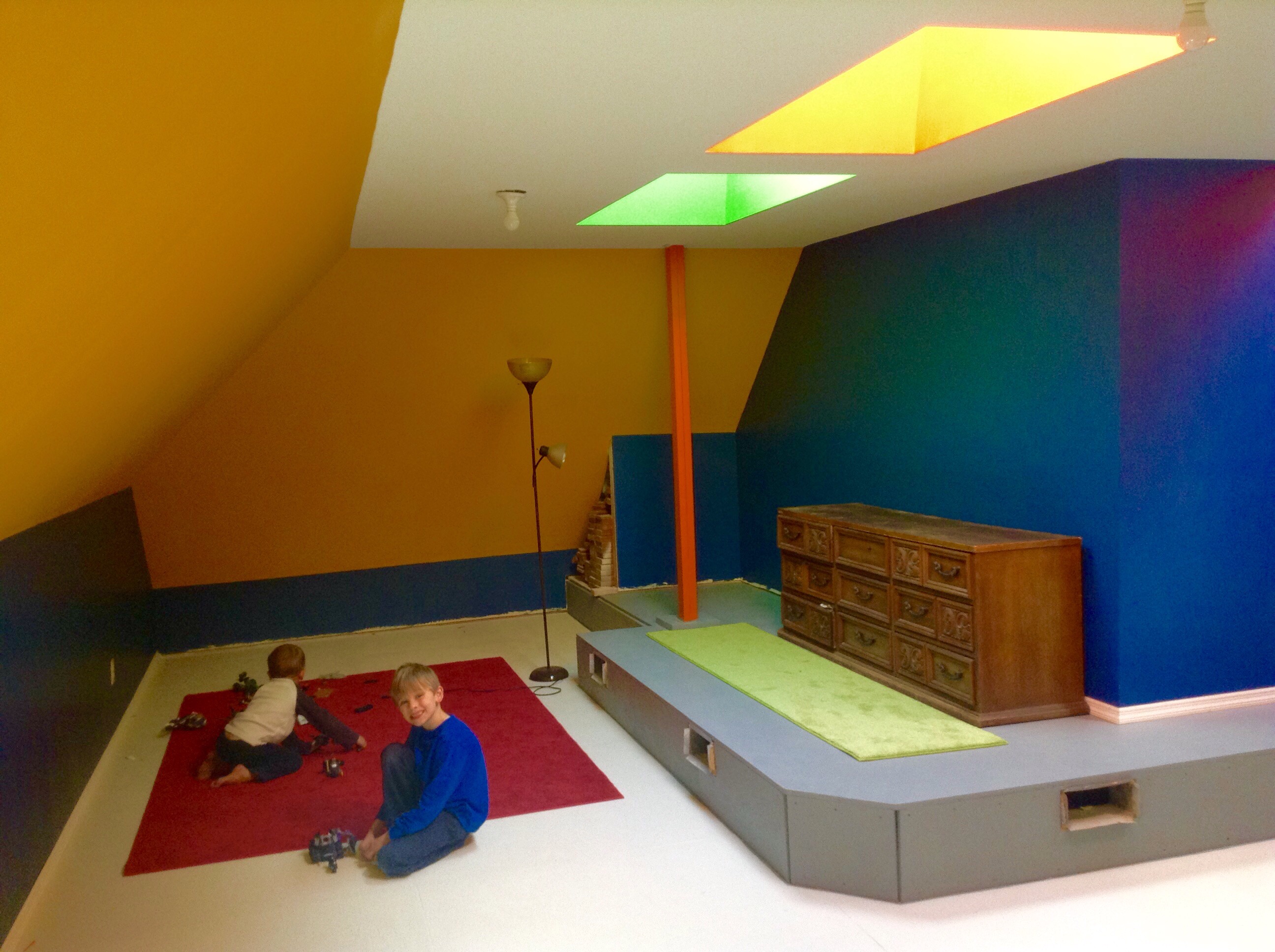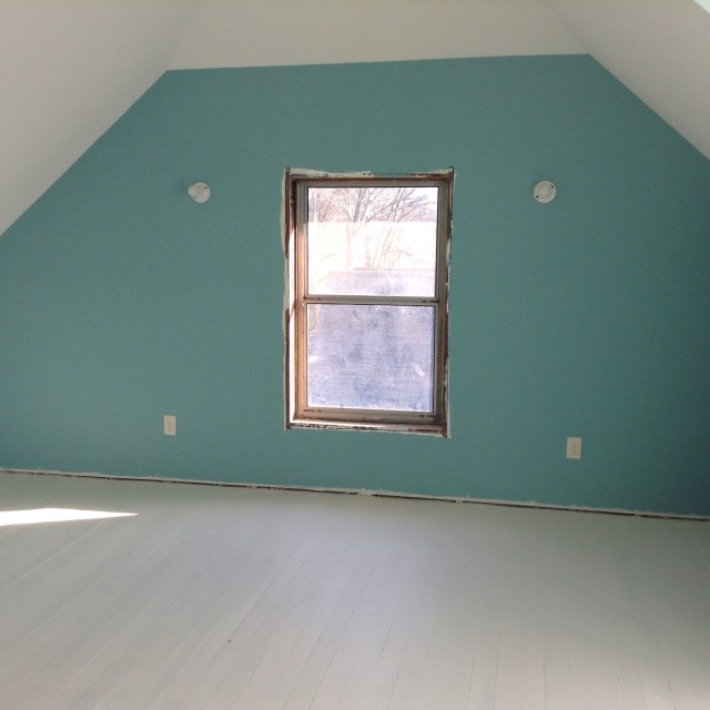 There is a small platform running around half of it with two steps leading to the ‘main floor’ if you will. There are sloping ceilings and big skylights and four enormous holes for windows without, of course, any windows in them yet. So deciding where to put our lovely colors was a challenge. But I did my best.