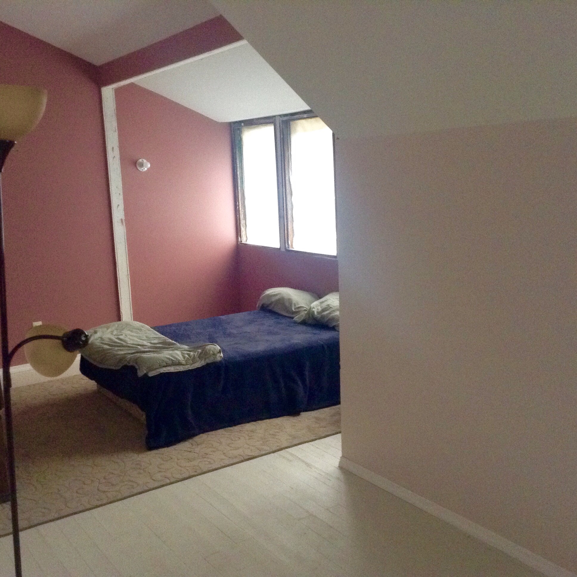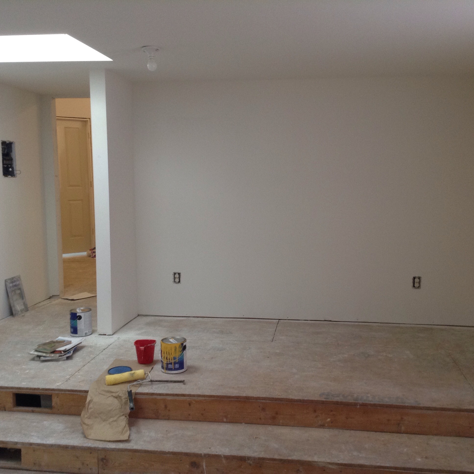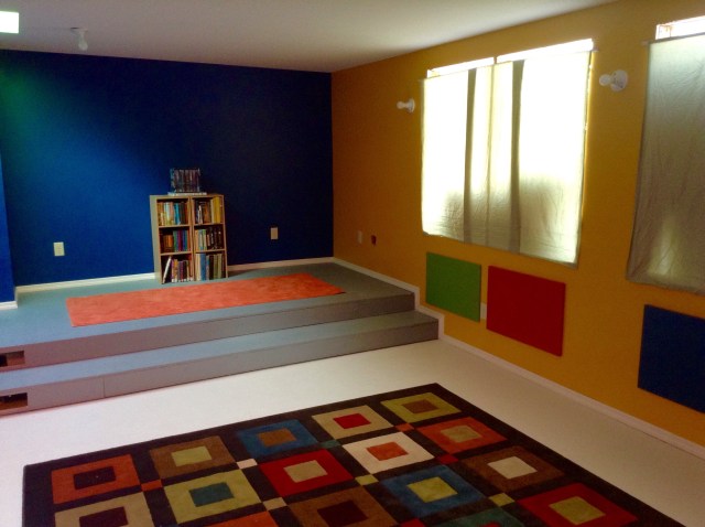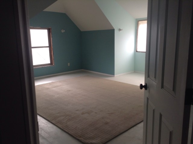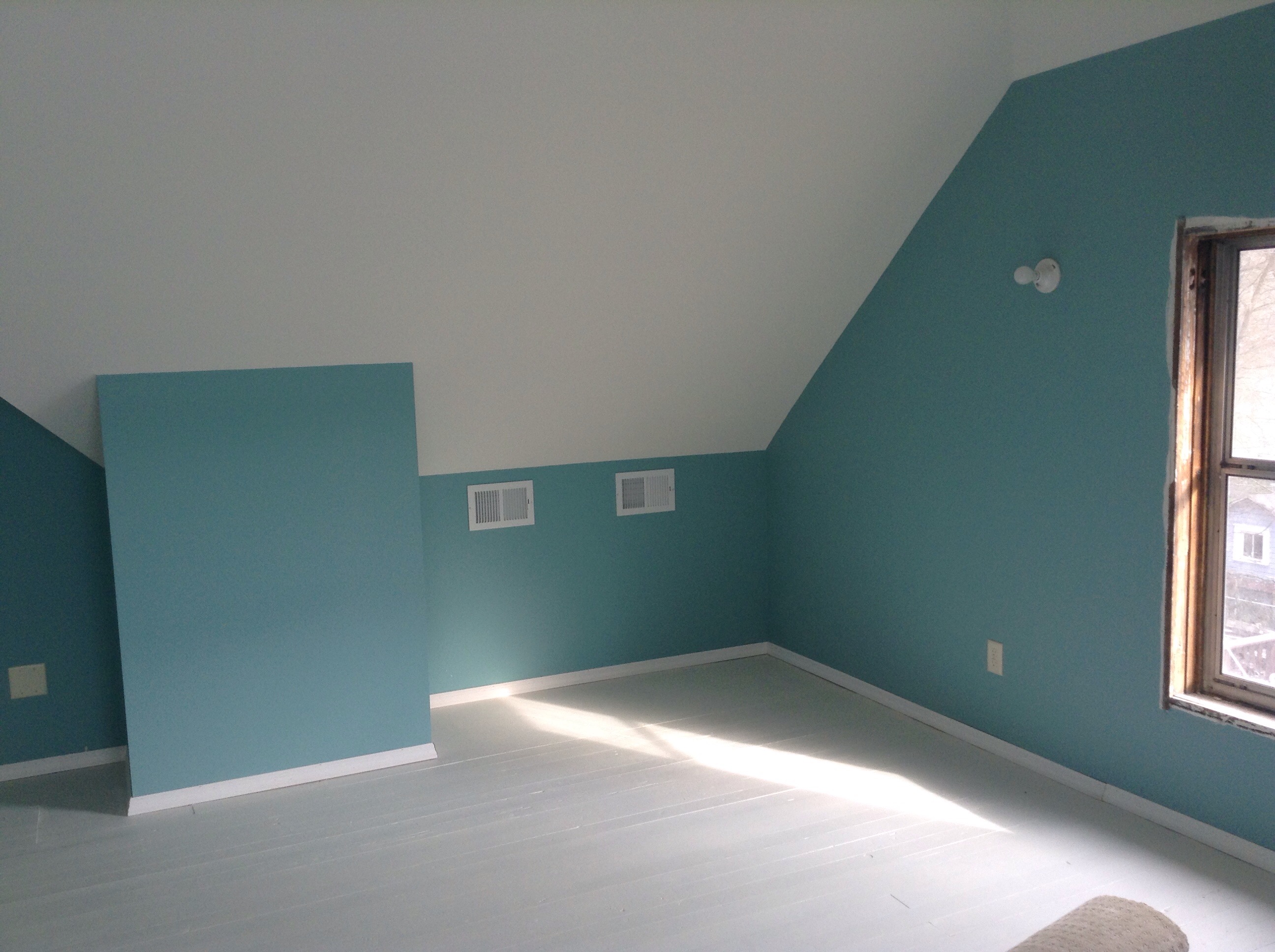 There is a small platform running around half of it with two steps leading to the ‘main floor’ if you will. There are sloping ceilings and big skylights and four enormous holes for windows without, of course, any windows in them yet. So deciding where to put our lovely colors was a challenge. But I did my best.