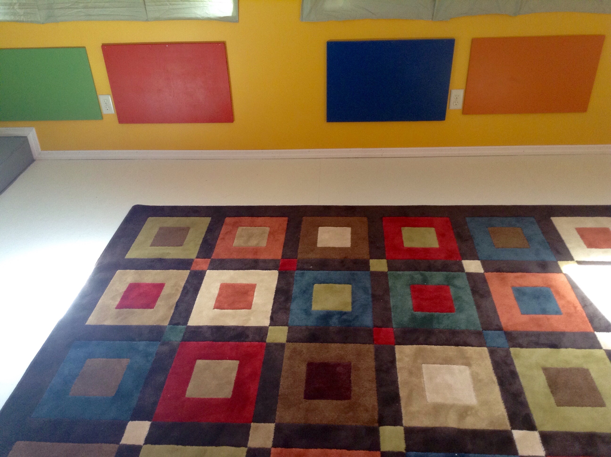 We also needed some kind of rug to cover the vast floor space, so on our way home from church one day, we swung by a salvage store that just happened to have the very rug we needed. It had just come through the door and was priced incredibly low. We grabbed it, along with some smaller accent rugs in equally loud colors. At this point, I was all in. Go big or go home, right? And somehow, remarkably, the room came together. That, or I had just been looking at everything so long that I was willing it to work, whether or no.
