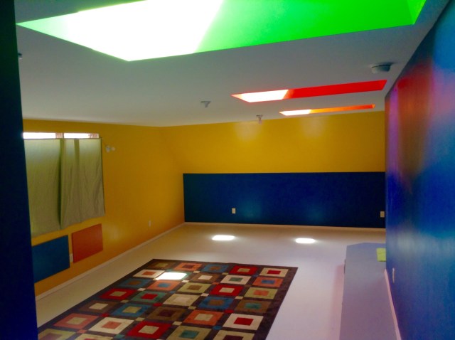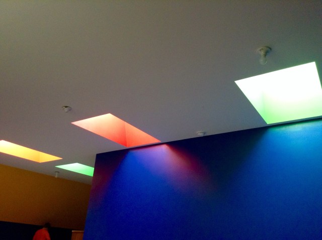 Well, I thought the floor looked okay. But where to put the other colors? I couldn’t decide if his next idea was insane or brilliant. He suggests painting the light wells to the skylights different colors. Would that be totally over the top? But I figured at this point, there was no going back- might as well embrace the insanity. I got a ladder and started in.